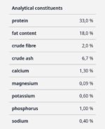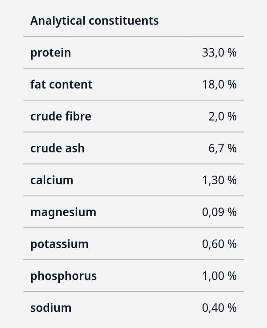 پروتئین مرغ خشک، ذرت کامل، برنج، تفالهی گوشت، چربی مرغ، فیبر چغندر، پروتئین حیوانی هیدرولیز شده، جگر مرغ هیدرولیز شده، مواد معدنی، گیاهان دارویی و میوهها.